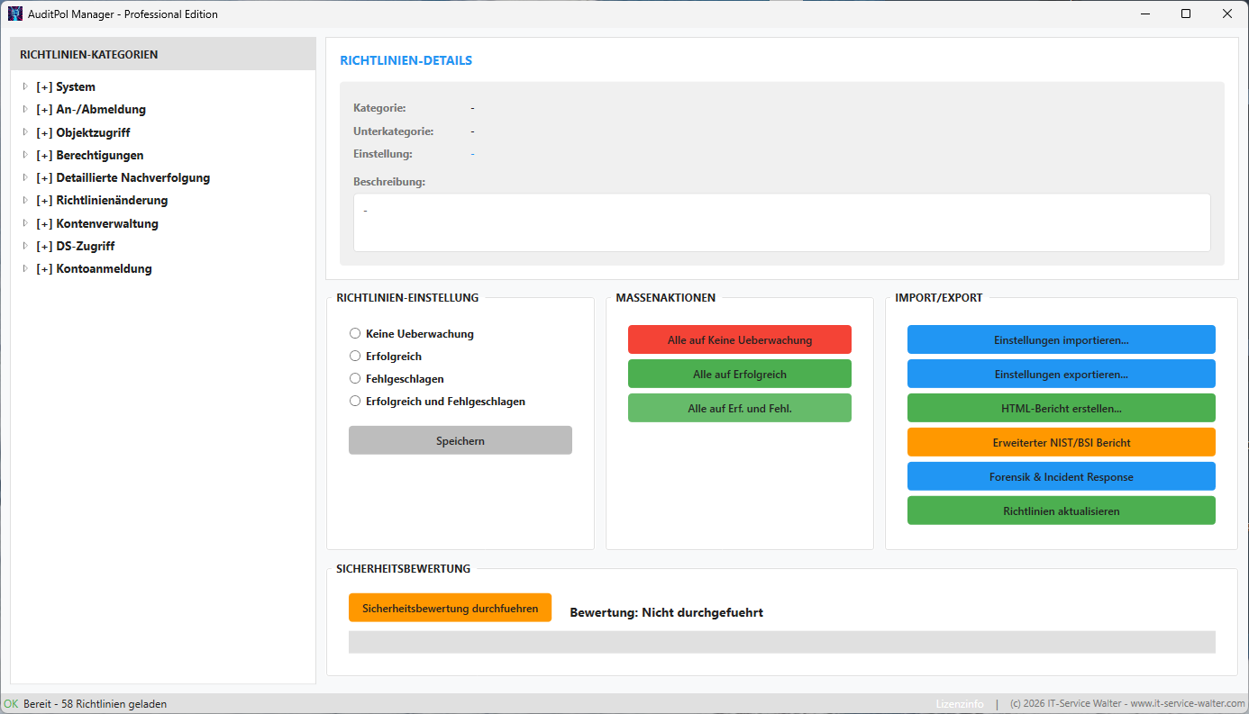 Mit diesem Tool können Unternehmen ihre Sicherheitsüberwachung optimieren, regulatorische Anforderungen erfüllen und die Erkennung von Sicherheitsvorfällen erheblich verbessern. Die Software transformiert die komplexe Windows-Auditpol-Verwaltung in einen übersichtlichen, effizienten Prozess mit umfassenden Reporting-Funktionen und Best-Practice-Empfehlungen basierend auf internationalen Sicherheitsstandards.