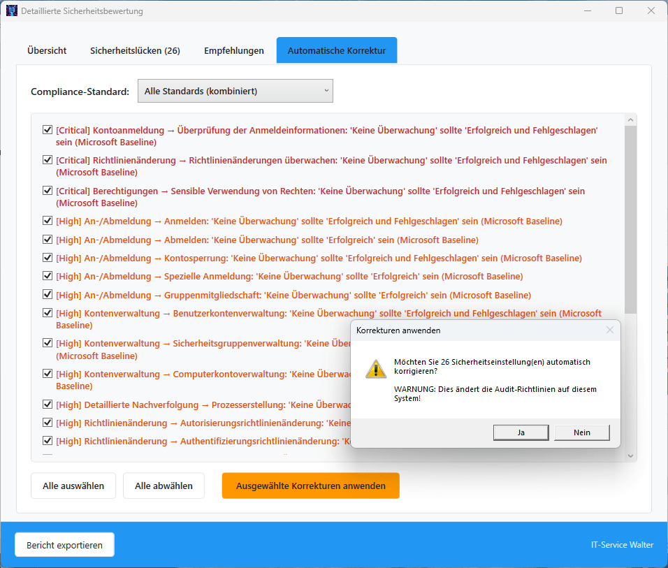 Automatisierte Analyse der aktuellen Audit-Konfiguration mit detailliertem Scoring-System. Das Tool bewertet Ihre Einstellungen gegen Microsoft Security Baselines und vergibt eine Note von A+ bis F. Die Bewertung berücksichtigt: