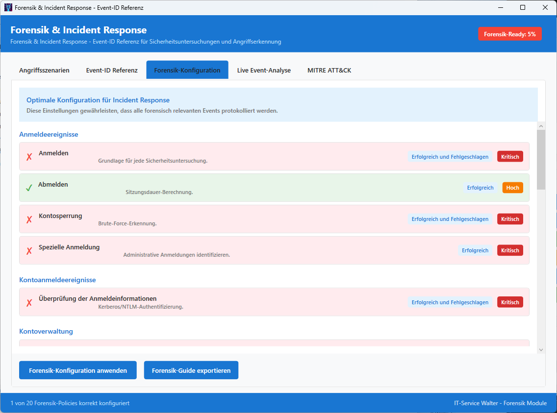 Durch die richtige Konfiguration der Überwachungsrichtlinien werden wichtige forensische Daten für Incident Response und Sicherheitsuntersuchungen gesammelt. Das Tool zeigt, welche Event-IDs für verschiedene Angriffsszenarien relevant sind und wie diese optimal konfiguriert werden.