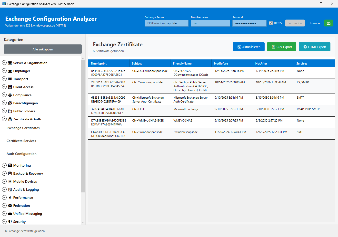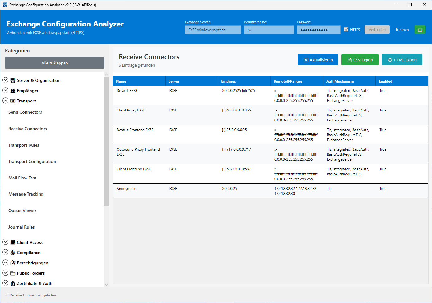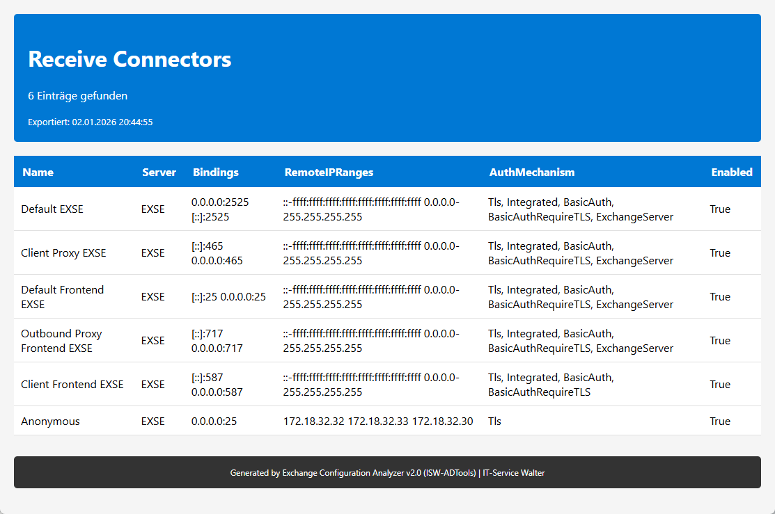 Der Exchange Configuration Analyzer ist ein professionelles Werkzeug zur umfassenden Analyse und Dokumentation Ihrer Microsoft Exchange Server Infrastruktur. Mit über 75 verschiedenen Abfragen erhalten Sie einen vollständigen Überblick über alle wichtigen Konfigurationsaspekte Ihres Exchange-Systems.