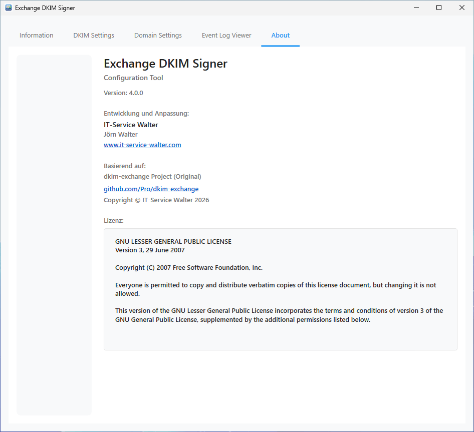 Das Projekt basiert auf dem ursprünglichen dkim-exchange Projekt und steht unter der LGPL v3 Lizenz. Der Transport Agent bleibt Open Source.