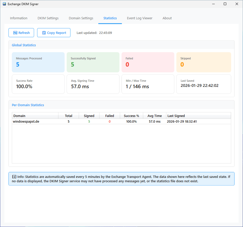 Der Statistics-Tab bietet detaillierte Echtzeit-Statistiken zur DKIM-Signierung. Die Daten werden vom Transport Agent erfasst und alle 5 Minuten automatisch gespeichert.