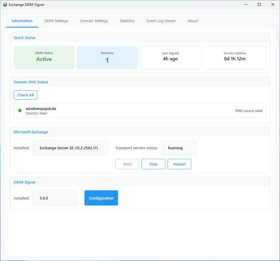 | Dashboard | Neuer Information-Tab mit Quick Status Übersicht: DKIM-Status, konfigurierte Domains, letzte Signatur und Service Uptime auf einen Blick. Zusätzlich Domain DNS Status mit Ampel-Anzeige. |