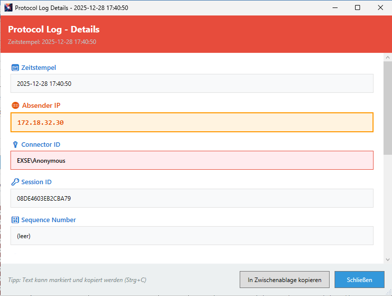 | Absender IP / Port | Remote-Endpoint (IP:Port) des Absenders |