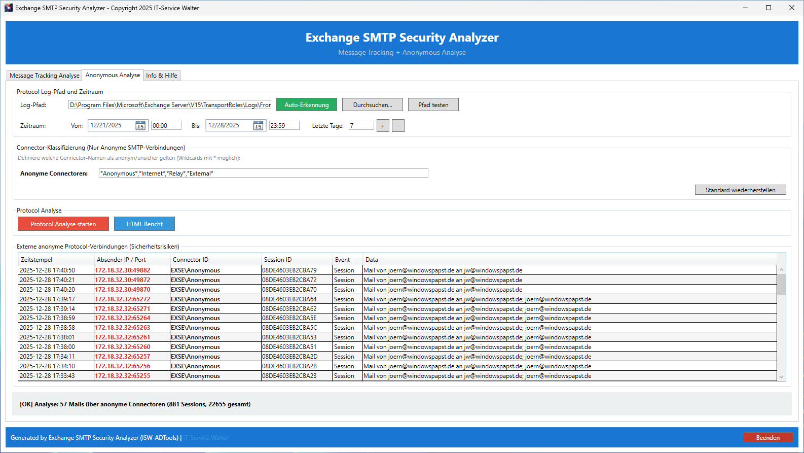 Die Protocol Log Analyse liest direkt die SMTP Protocol Log-Dateien und identifiziert Verbindungen über anonyme Receive Connectors. Dies ist die empfohlene Methode zur Sicherheitsanalyse.