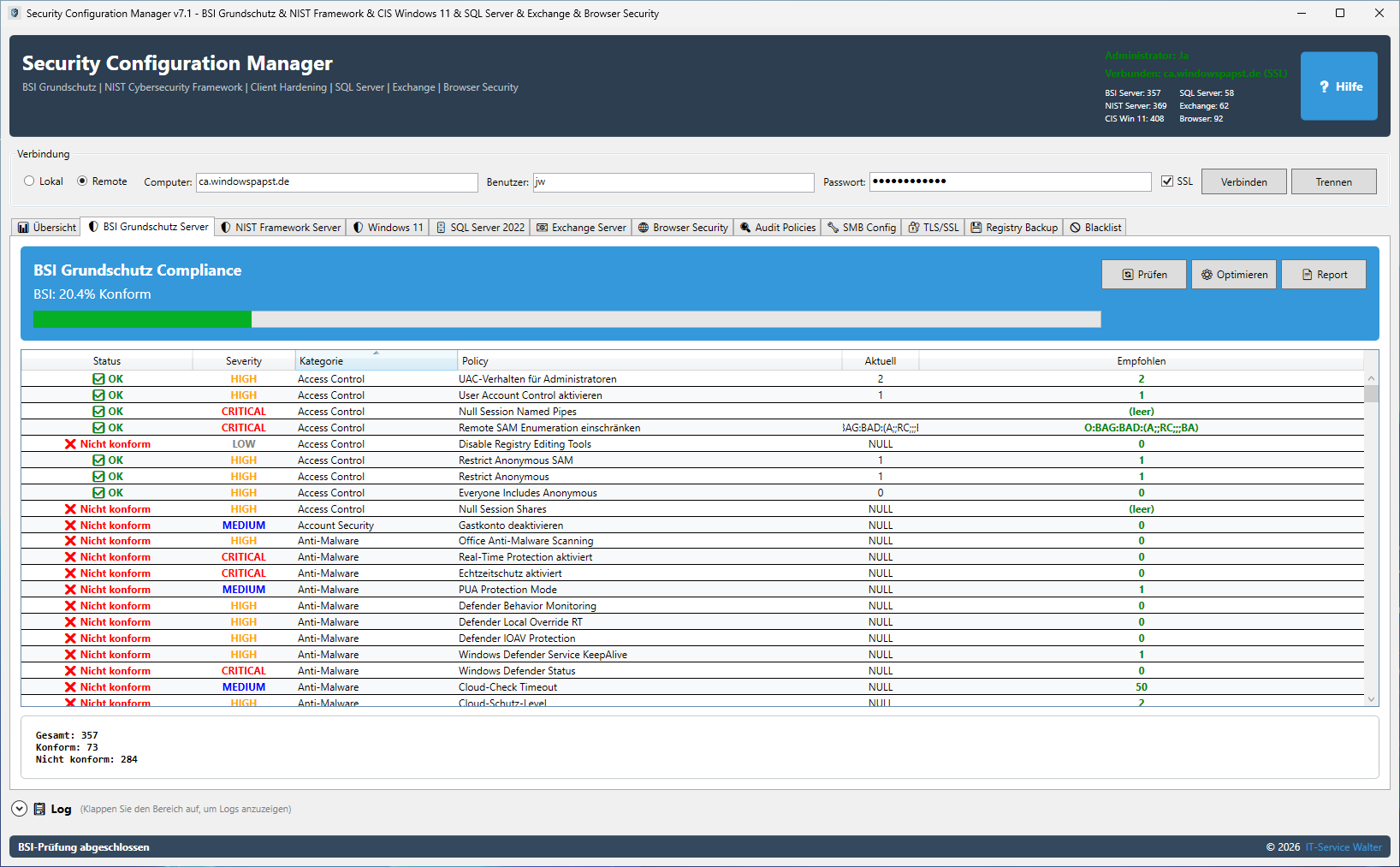 Unternehmen stehen unter zunehmendem Druck, Sicherheitsstandards wie BSI IT-Grundschutz, NIST, ISO 27001 oder PCI-DSS einzuhalten. Manuelle Prüfungen sind zeitaufwendig und fehleranfällig. Der Security Configuration Manager automatisiert diese Prozesse und liefert sofort verwendbare Compliance-Reports.