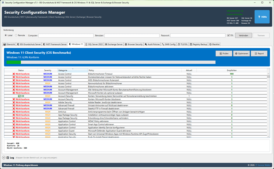 Der Security Configuration Manager 7.1 ist eine professionelle Softwarelösung für IT-Administratoren und Sicherheitsverantwortliche. Das Tool automatisiert die Überprüfung und Härtung von Windows-Systemen nach anerkannten internationalen Sicherheitsstandards.