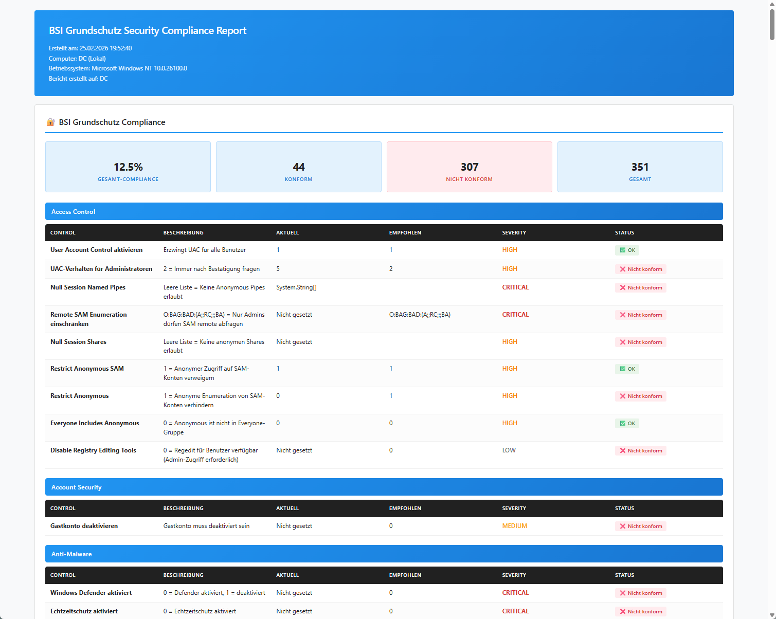 | Standards | BSI (350+), NIST (360+), CIS Win11 (400+), SQL 2019-2025 (60+), Exchange (65+), Browser (98+) |