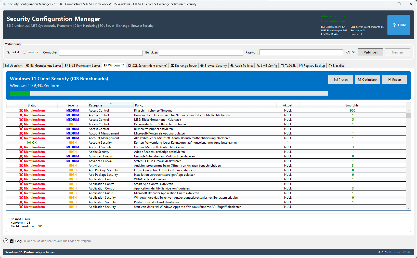 Der Security Configuration Manager 7.2 ist eine professionelle Softwarelösung für IT-Administratoren und Sicherheitsverantwortliche. Das Tool automatisiert die Überprüfung und Härtung von Windows-Systemen nach anerkannten internationalen Sicherheitsstandards.