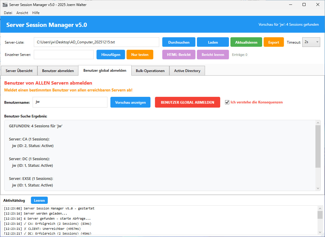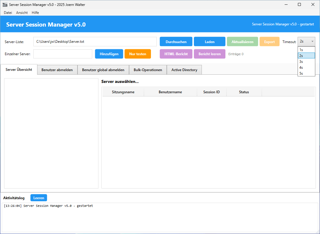 Der Server Session Manager v5.0 ist ein Windows-Tool zur Verwaltung von Remote Desktop Sessions auf mehreren Servern gleichzeitig. Das Tool ermöglicht das Überwachen aktiver Sessions und das gezielte oder massenhafte Abmelden von Benutzern.