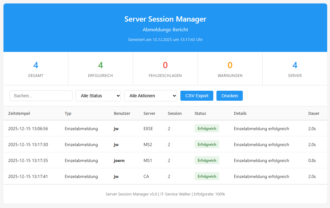 Die verschiedenen Export-Funktionen dienen unterschiedlichen Zwecken. Der CSV-Export in Tab 1 dient der Auswertung von Session-Daten und enthält alle Server, Sessions und Status-Informationen im CSV-Format mit Headers für Excel und Analyse-Tools.