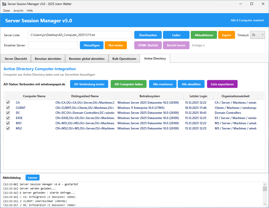 Die Active Directory Integration ermöglicht das automatische Laden von Computer-Objekten aus dem Active Directory. Die Funktionen umfassen das Testen der AD-Verbindung, das Laden von Computer-Objekten, das Hinzufügen ausgewählter Computer zur Server-Liste und den Export der Computer-Liste.