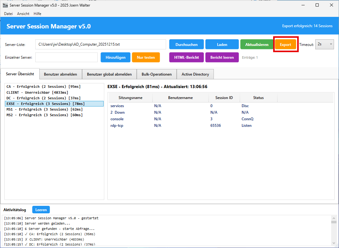 Alle Export-Dateien werden mit Zeitstempel gespeichert, beispielsweise SessionReport_20250927_142530.csv, AD_Computer_Liste_20250927_142530.txt oder SessionManager_Report_20250927_142530.html.