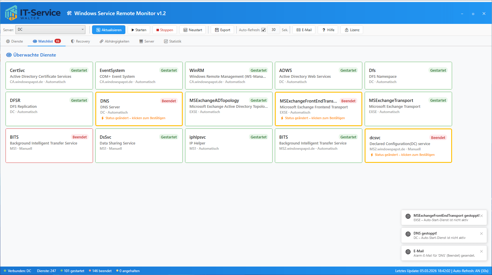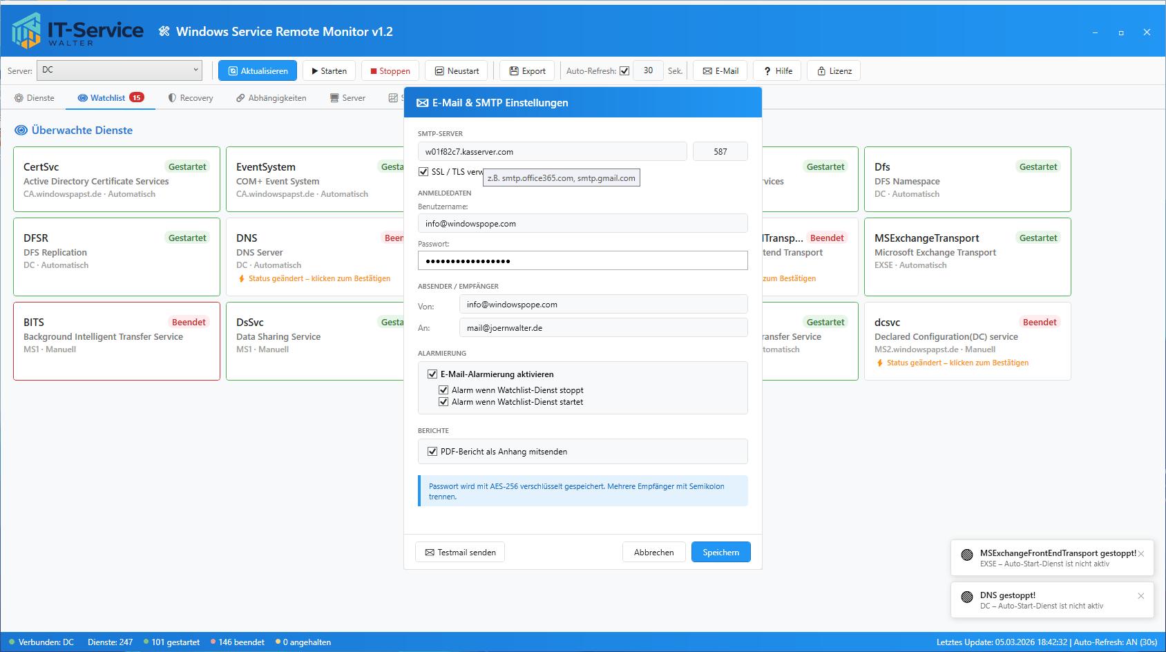 Sobald ein Watchlist-Dienst seinen Status ändert, kann das Tool automatisch eine E-Mail an definierte Empfänger senden. Die Konfiguration ist flexibel: