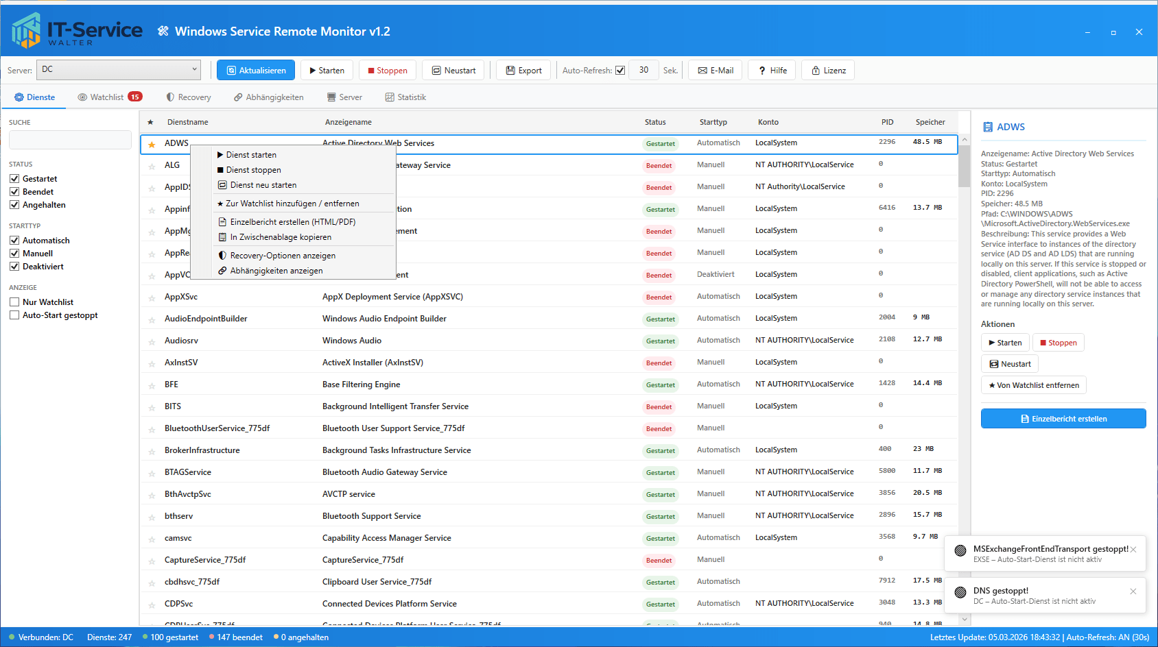 - Direktsteuerung per Rechtsklick: Starten, Stoppen, Neustart direkt aus der Watchlist