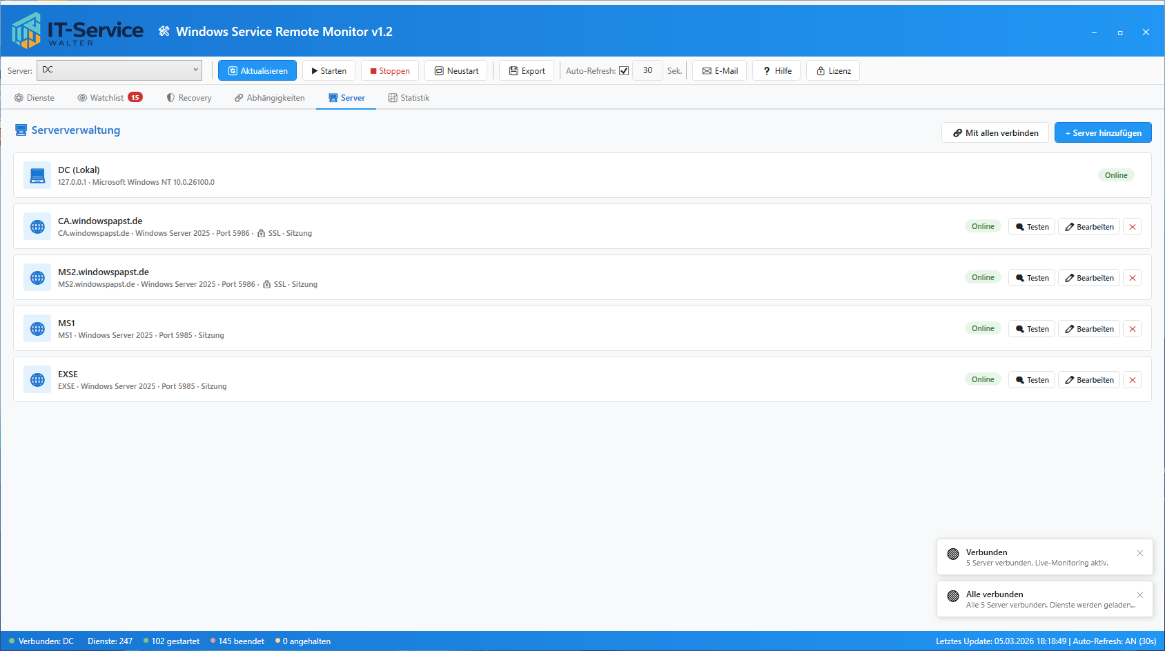 - Serverübergreifende Überwachung aller markierten Dienste auf einen Blick