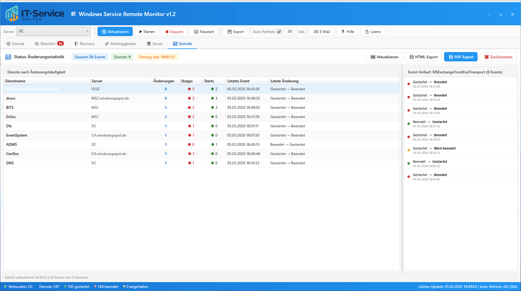 Der Statistik-Tab protokolliert automatisch alle Statusänderungen von Watchlist-Diensten während der Laufzeit der Anwendung: