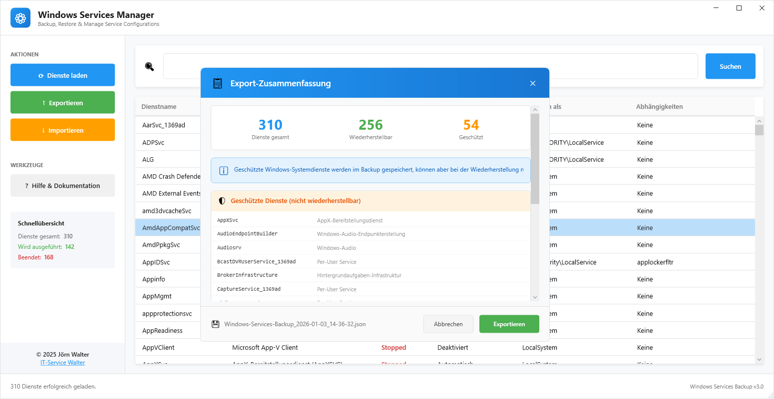 Der Export erstellt eine Sicherungsdatei aller Dienstkonfigurationen.