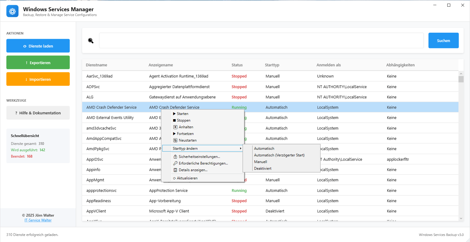 - 🔄 Neustarten: Stoppt und startet einen Dienst (mit Bestätigung)